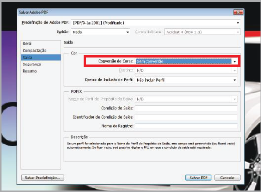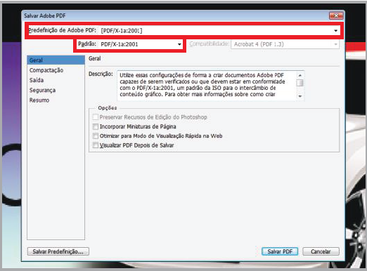 Nesta janela, selecione a "Predefinição de Adobe PDF" para "[PDF/X-1a:2001]"